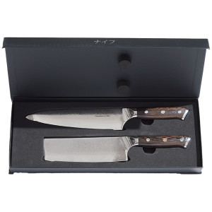 Settet består av to kniver som utfyller hverandre perfekt: En kraftig kokkekniv på 32 cm som takler alt fra filetering av fisk til grov kutting av kjøtt, og en presis grønnsakskniv på 30 cm med rett blad for detaljert hakking og kutting. Sammen dekker de alle behov på et moderne kjøkken.